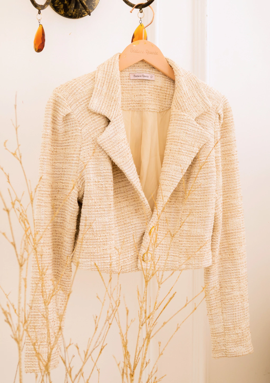 Descubra o sofisticado casaco no tweed, ideal para quem busca estilo e elegância. Este modelo forrado possui ombreiras que conferem estrutura e um caimento impecável. Os botões encapados com aro dourado na frente e nas mangas adicionam um toque de glamour à peça. Disponível na cor bege, a altura do casaco é de 0,42 cm.