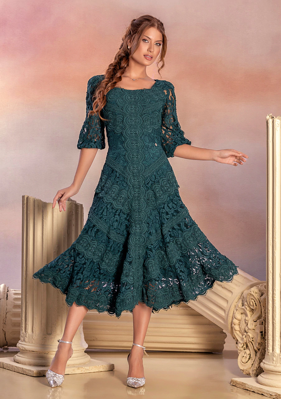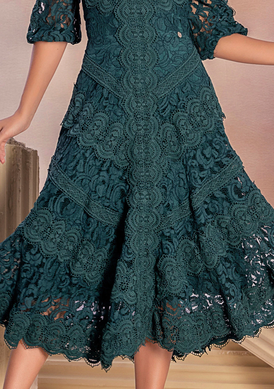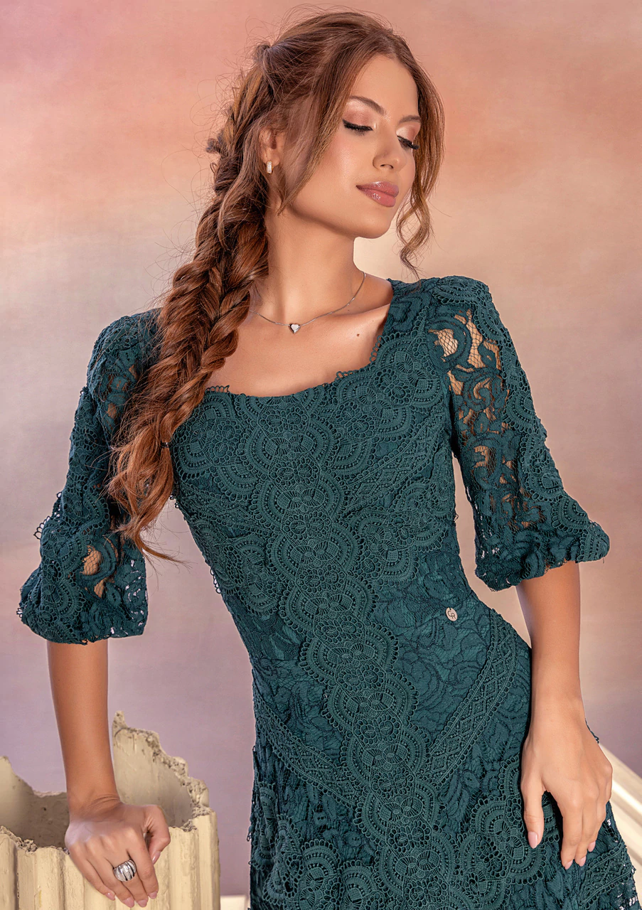 O vestido em Renda Forest é uma peça que une sofisticação clássica e delicadeza. Com comprimento midi e