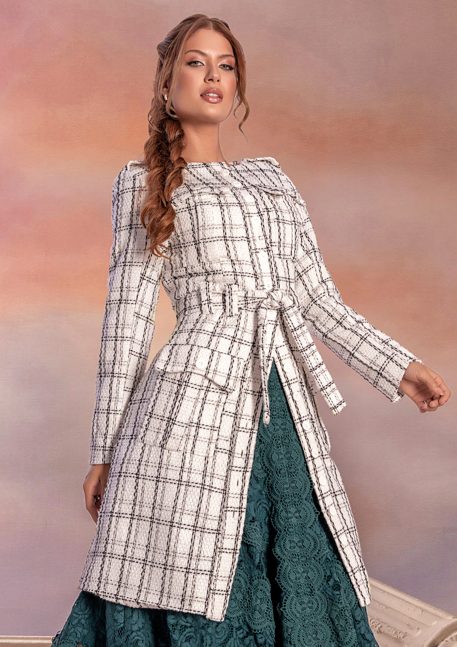 A cor terracota aquece o visual com um toque terroso e acolhedor, remetendo à beleza das esculturas antigas. Seu design é repleto de detalhes únicos, como as ombreiras sutis, o forro confortável e os entremeios aplicados na saia, corpo e mangas, que criam uma fluidez visual.