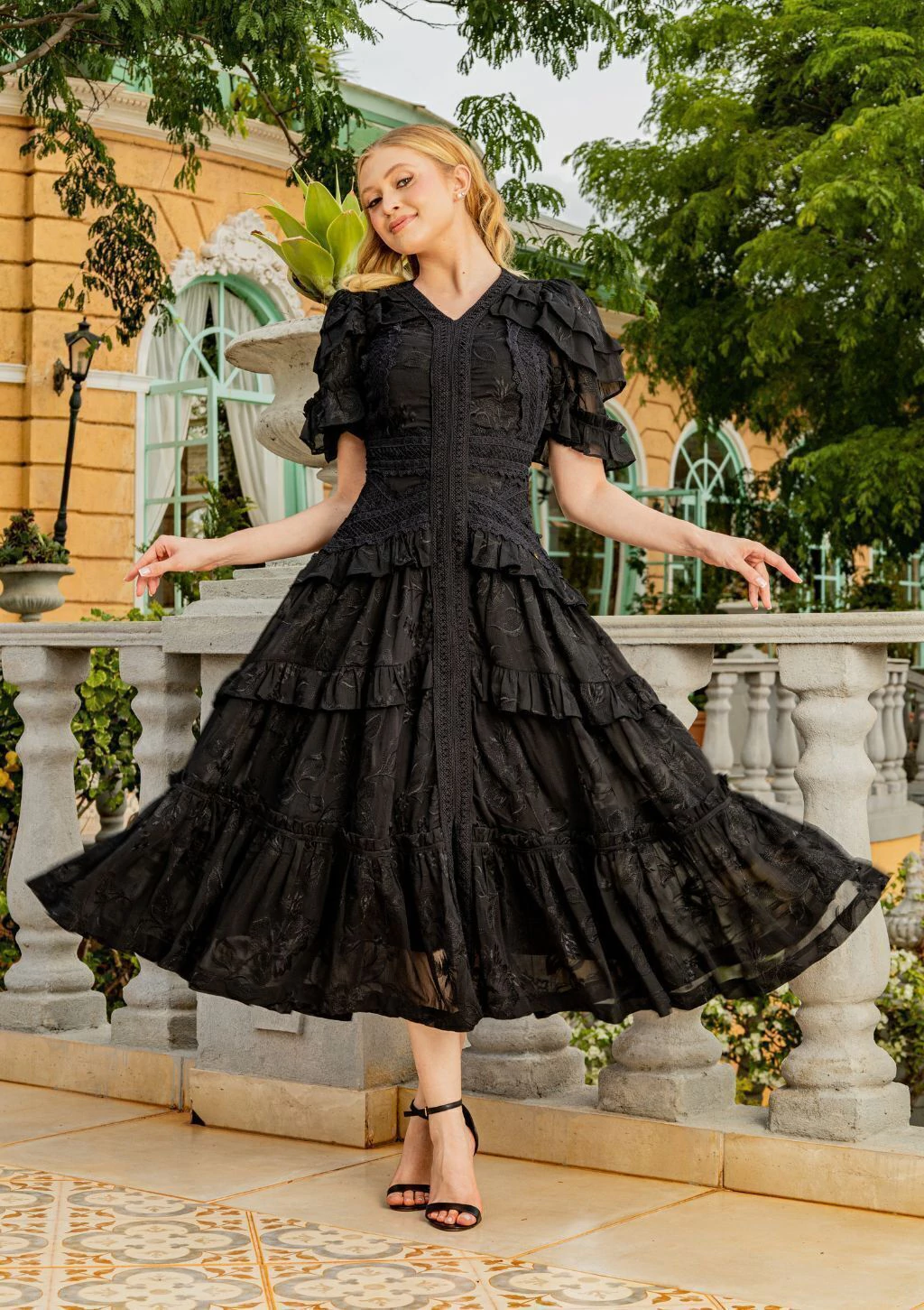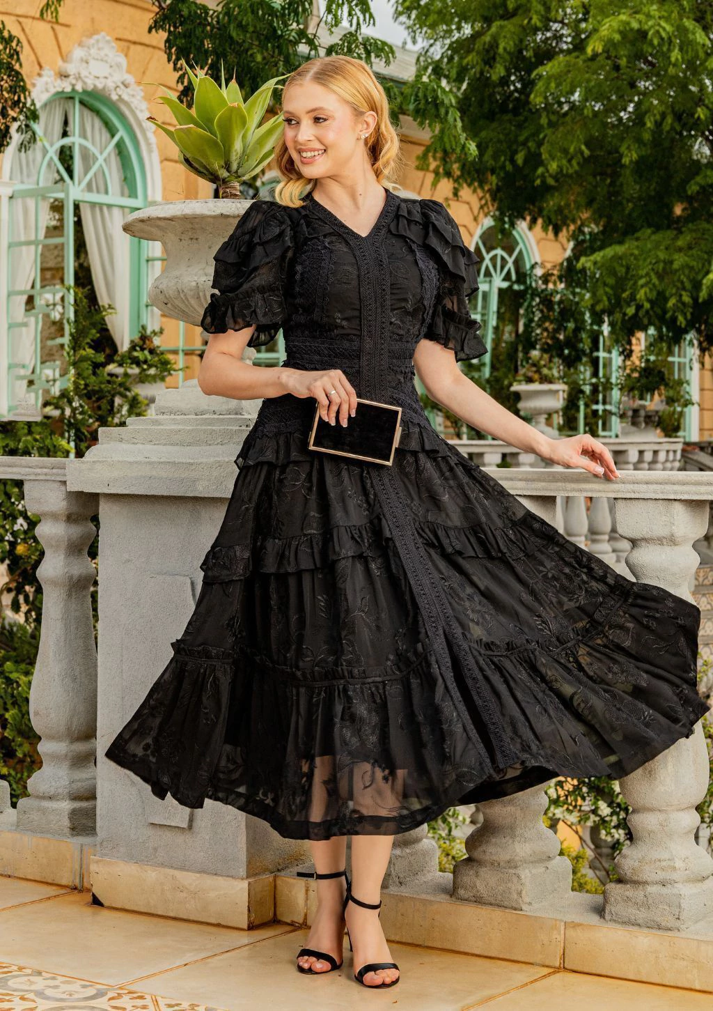 VESTIDO VALERIA - PRETO - Na essência da campanha Esplendor, o charme atemporal se revela em cada detalhe do vestido Valéria, confeccionados em chiffon bordado, onde a leveza do tecido encontra a sofisticação do design.